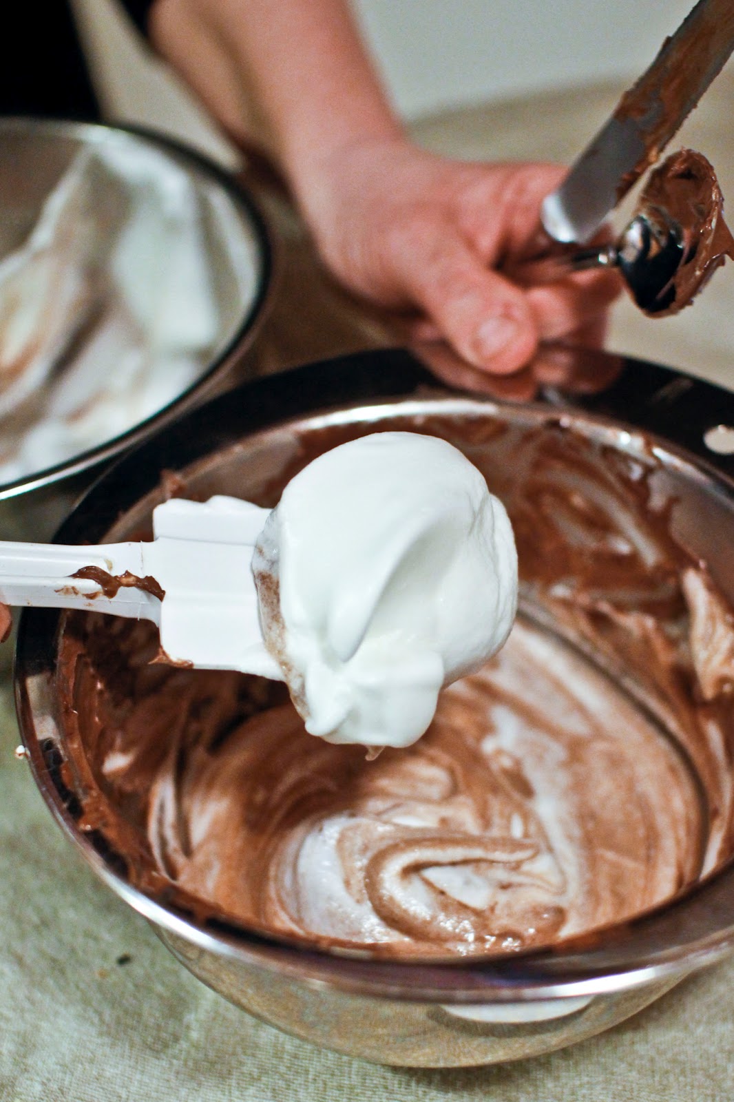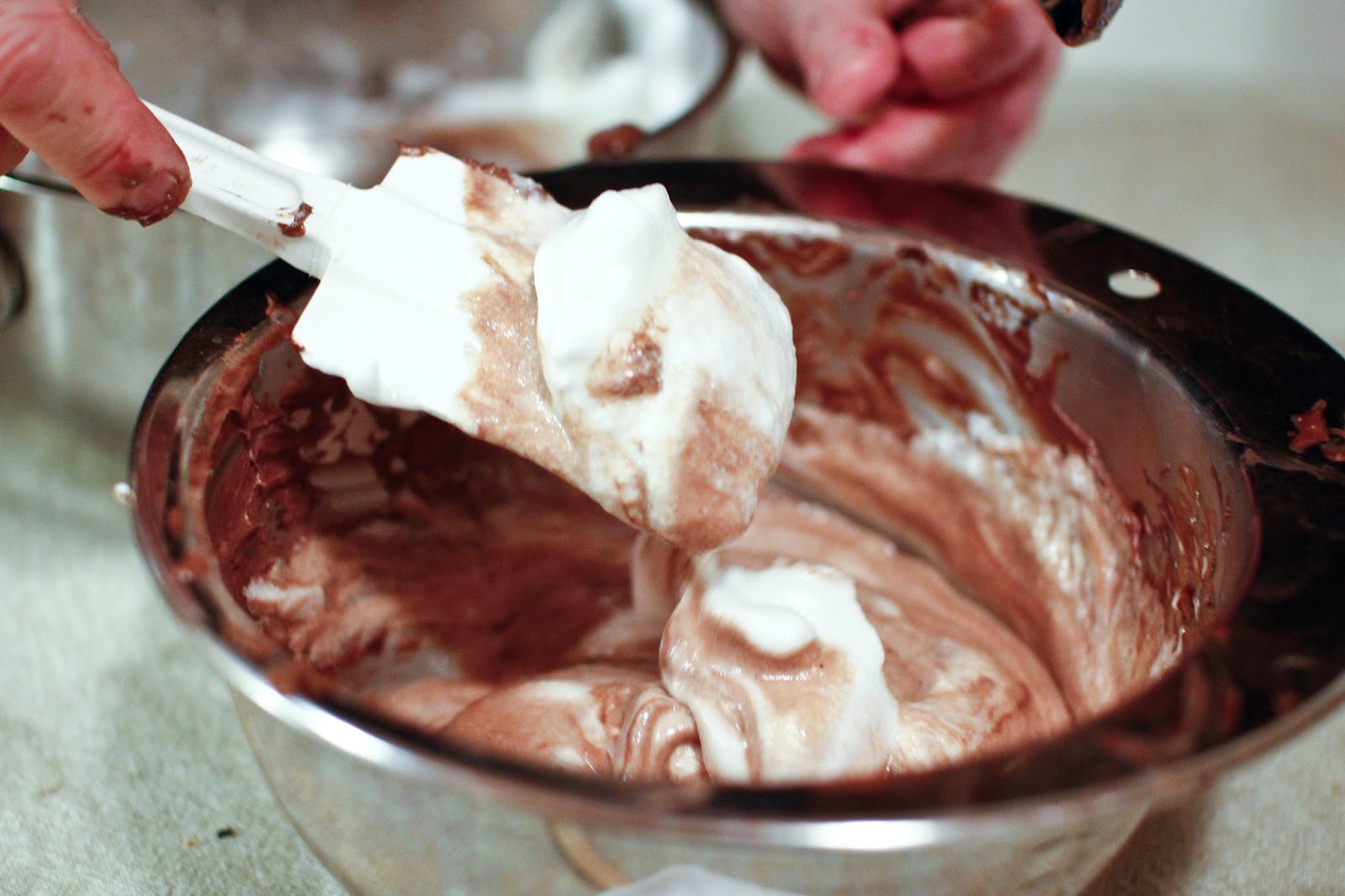 If you still see egg whites in the chocolate part, that's okay. You want to use a delicate hand here so these little suckers will rise to the occasion.