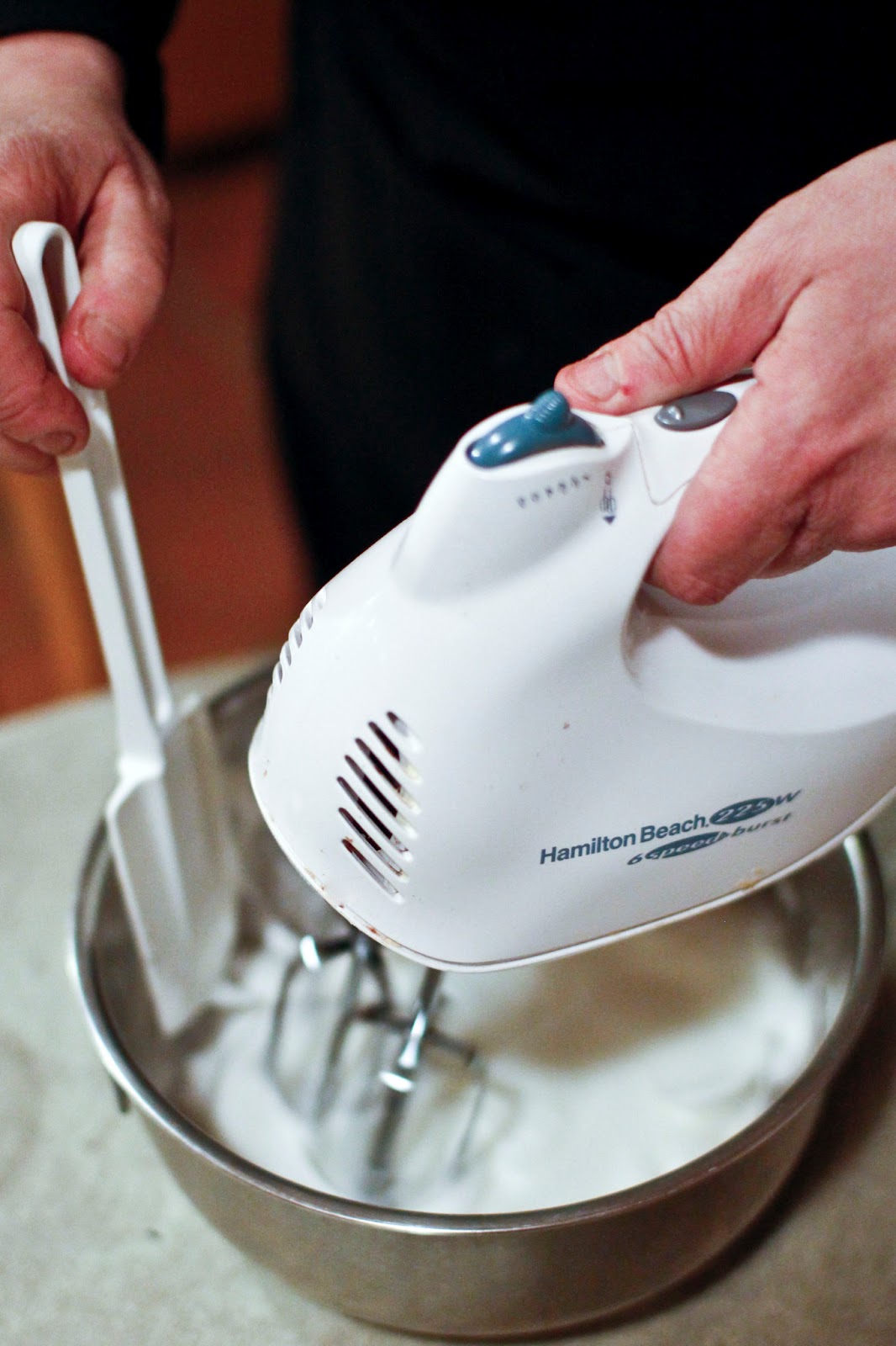 Add the sugar 1 Tbs at a time and beat it all in until the whites form mounds and hold their shape.