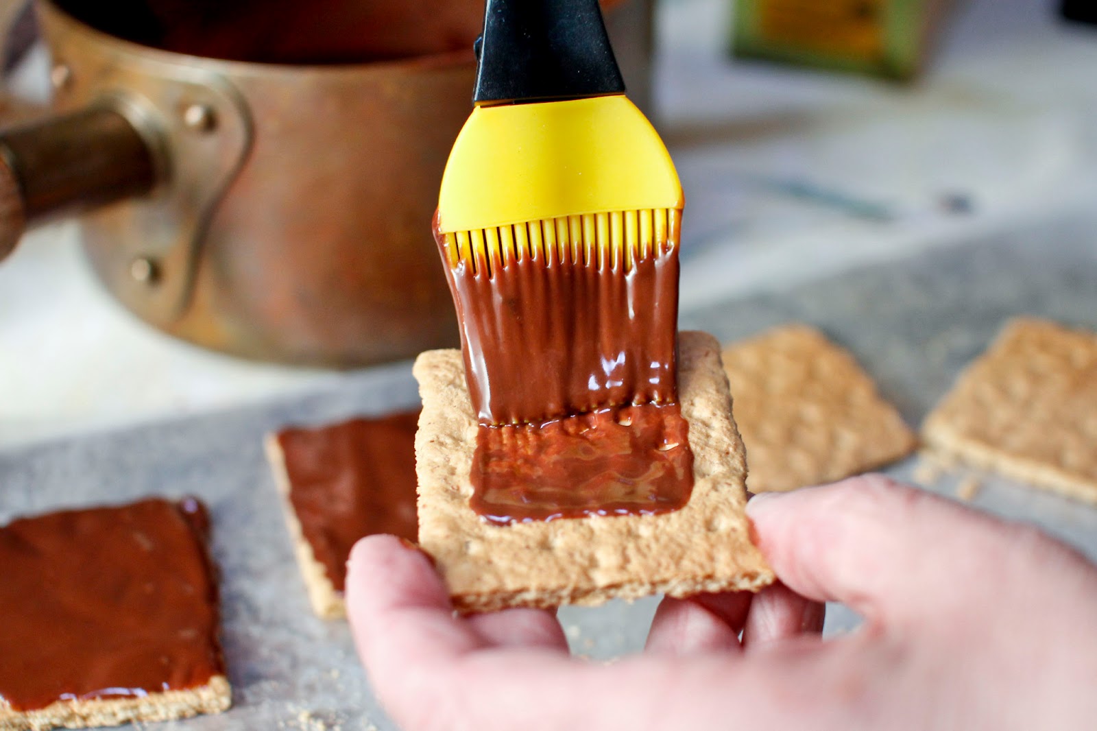 When the chocolate has cooled enough, thickly paint one side of a graham cracker with i.