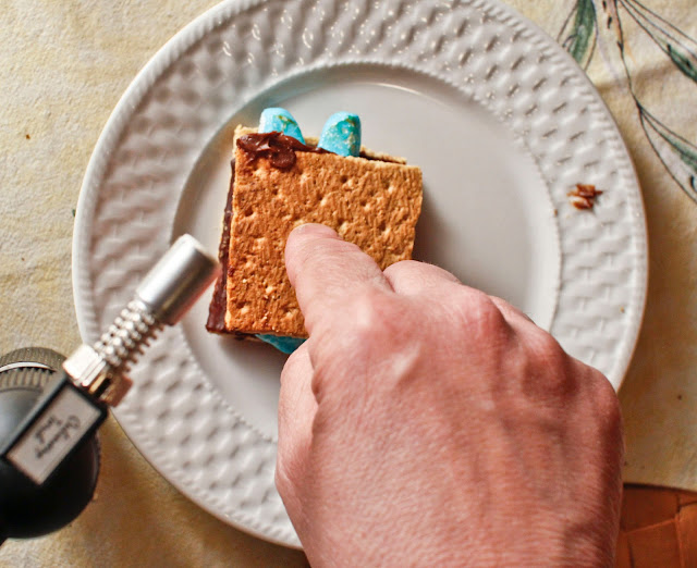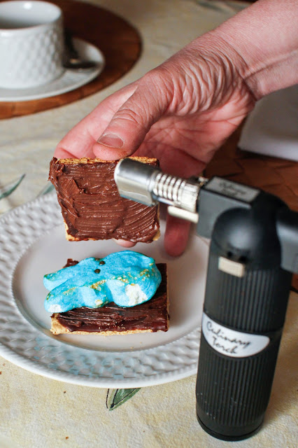 Using the culinary torch, toast the Peeps gently.