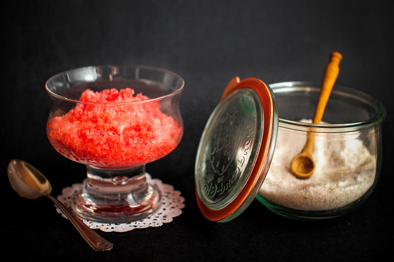 Granita, the perfect lazy individuals dessert. Pour stuff in the freezer and stir it with a fork every now and then. It does not get very much easier than that. Want this? Grab your watermelons and you can be enjoying this within a couple of hours.