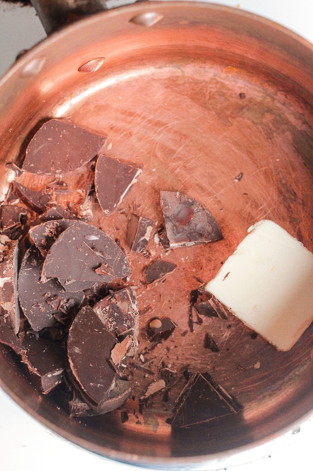 In a pan or skillet slowly melt the stick of butter with the chopped 6 oz of chocolate.