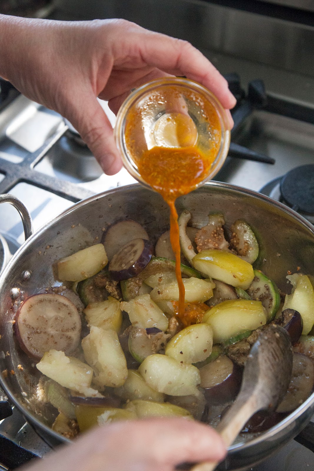 When everything has been browned, put the apples and eggplants back into the pan together.