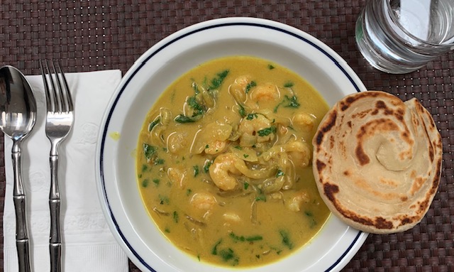 Coming up next. An Indian lunch of Kerala Shrimp Moilee and paratha.